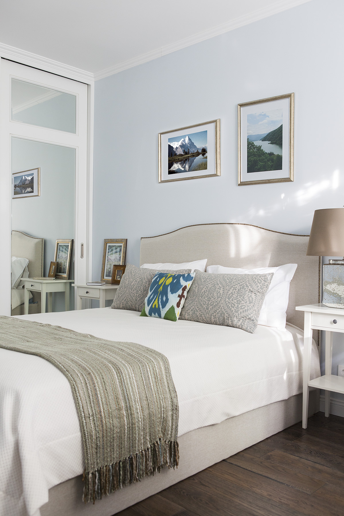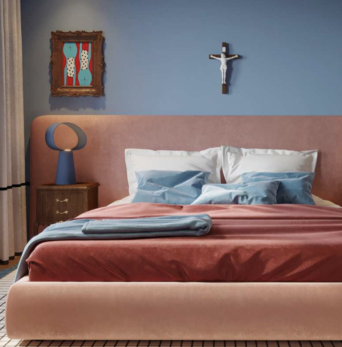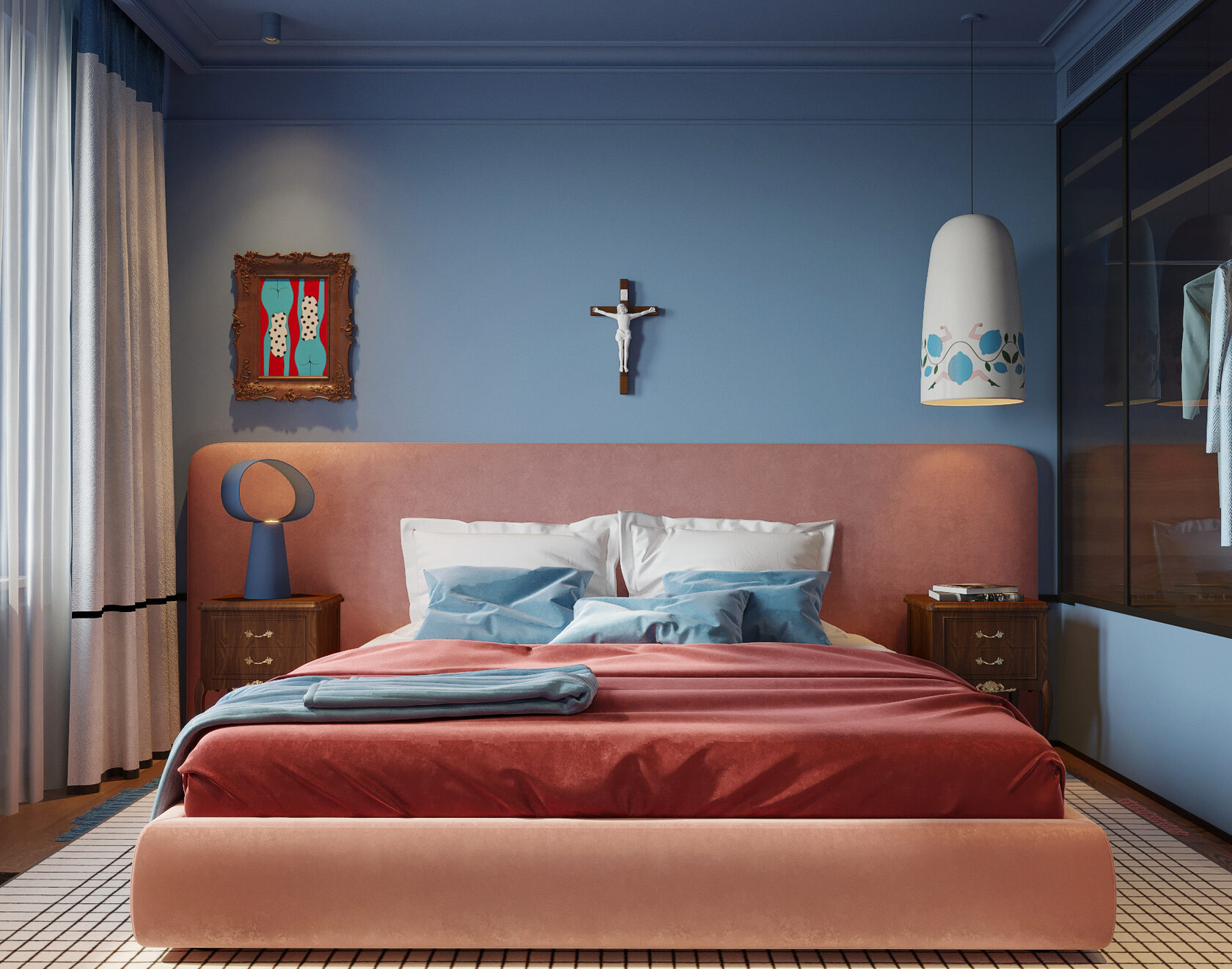 Основная мебель в спальне — кровать. Многие устанавливают модели с роскошным бархатным изголовьем, и глубокоматовая краска в этом случае становится самым выигрышным решением: глянцевый блеск упрощает интерьер, в то время как матовые поверхности выглядят дорого и элегантно, как и сам бархат или велюр. Также к глубоким тонам легче подбирать изящные детали — большие зеркала (они часто есть в спальнях), мебель с металлическими элементами (изголовье кровати или тумбы). Шторы используйте легкие, чтобы сохранять ощущение воздуха.