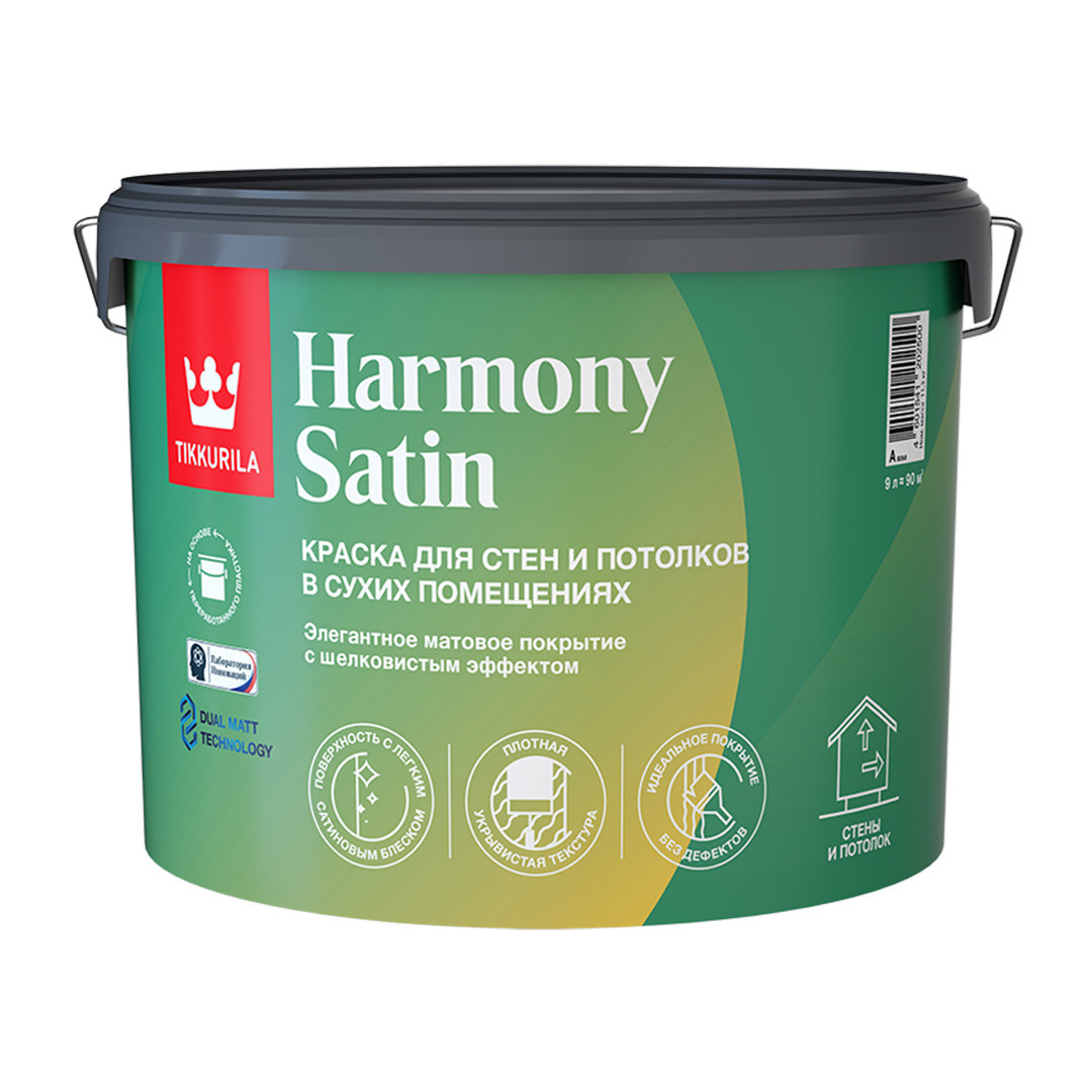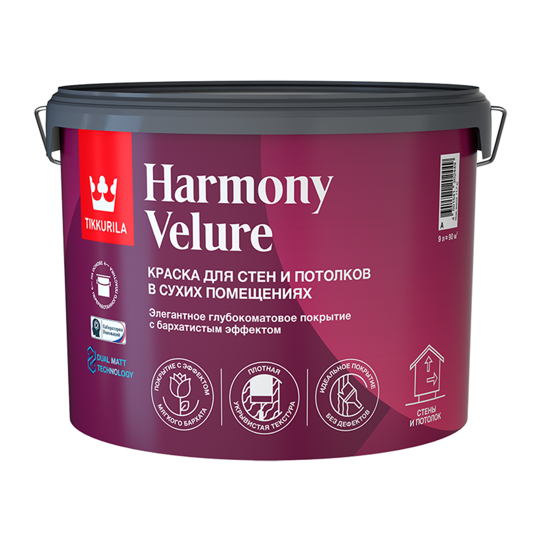 Tikkurila Harmony Velure с бархатистым эффектом: ее текстура укрывистая и однородная, что обеспечивает комфортное нанесение и желаемый результат без усилий. Заданную степень матовости гарантирует технология Dual Matt: даже при интенсивном боковом свете поверхность остается неизменной.